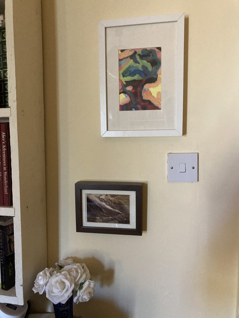 Today I’m working a late shift, in the evening. So during the day I’m doing lots of little things: returning an item to Amazon (Dixie cap US Navy hat, that’s too small); tidying the bedroom, area by area; mending a broken picture-frame; and hanging some art back up, on’t walls.