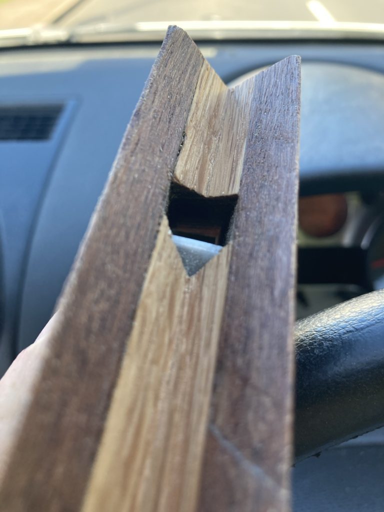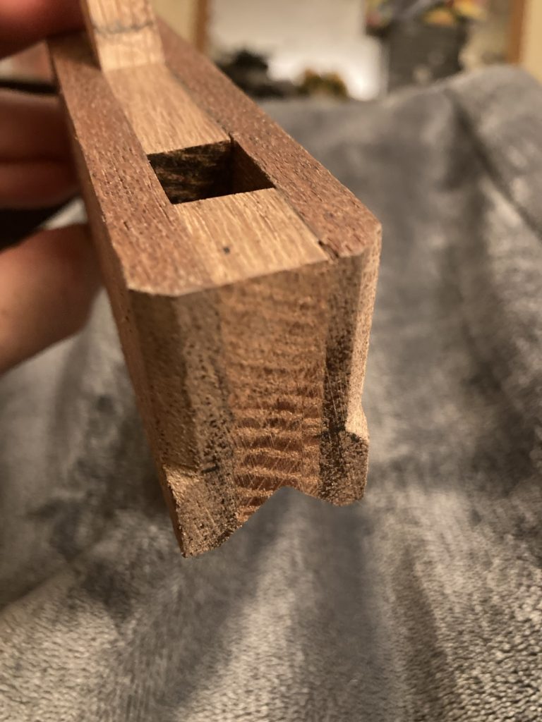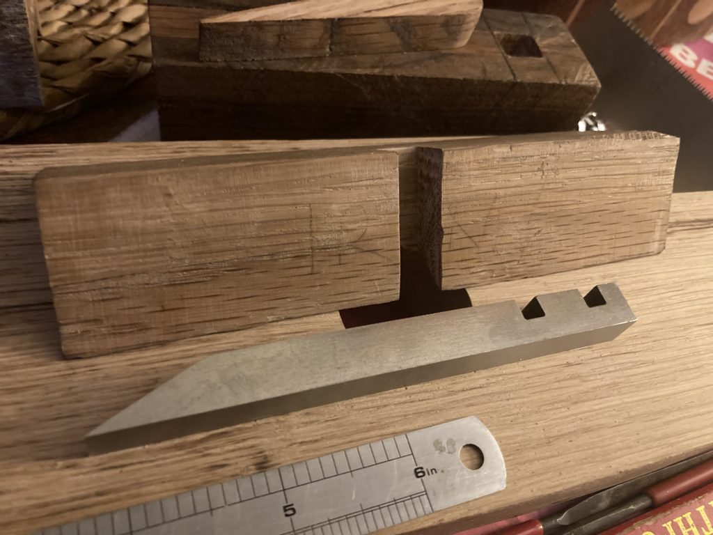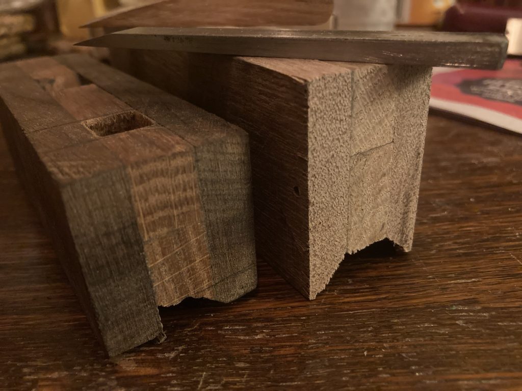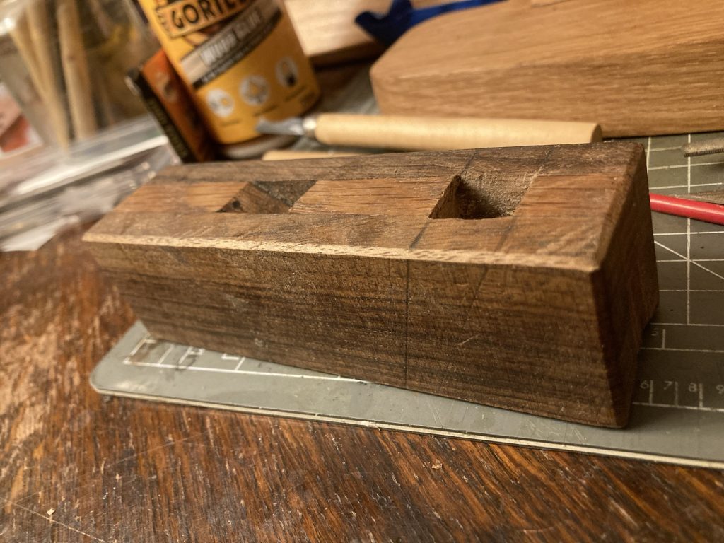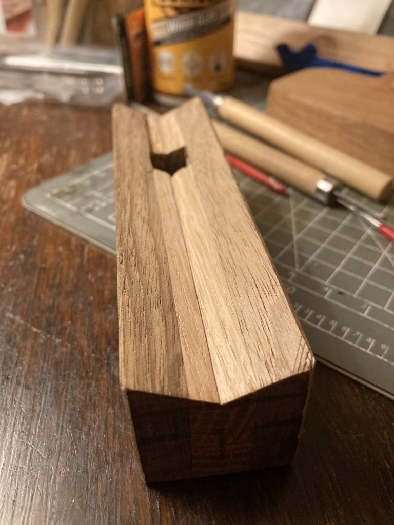 As can be seen above, the new bevel plane is going to have a bigger, deeper cutaway. I cut the 45° angles on the two side ‘cheeks’ in advance. These can function as guides for cutting into the central oak segment.