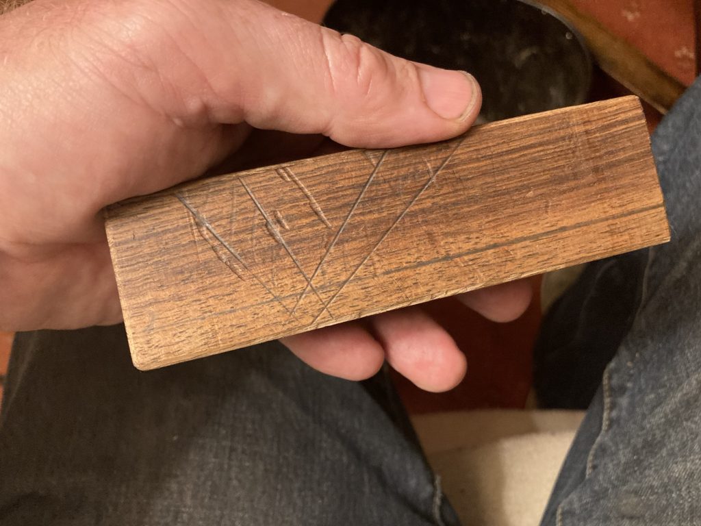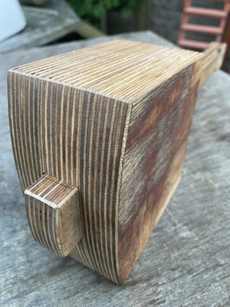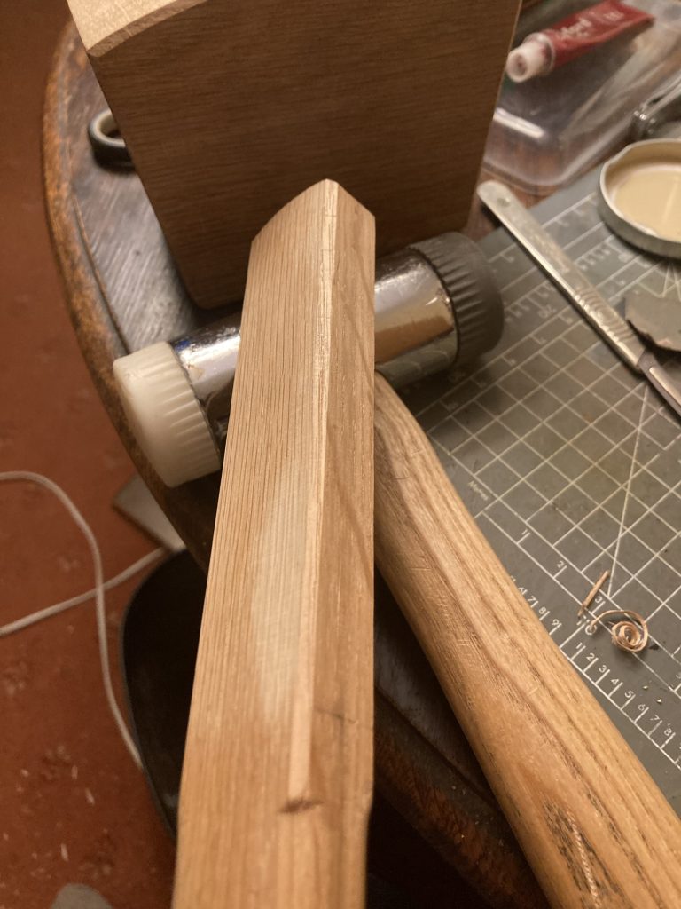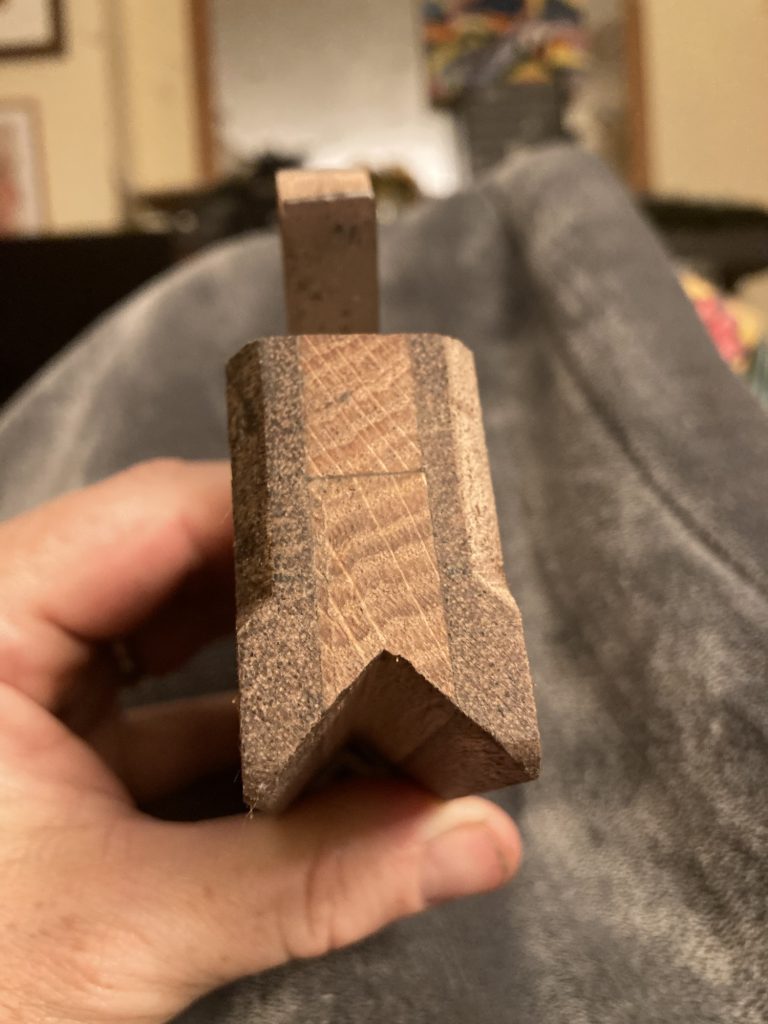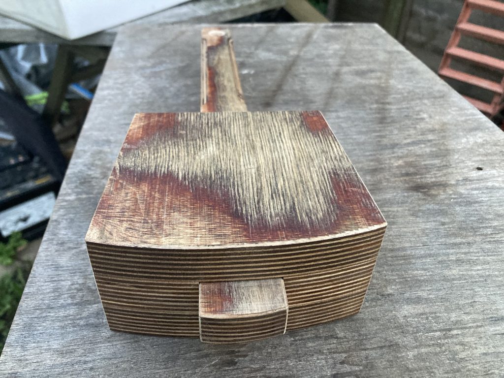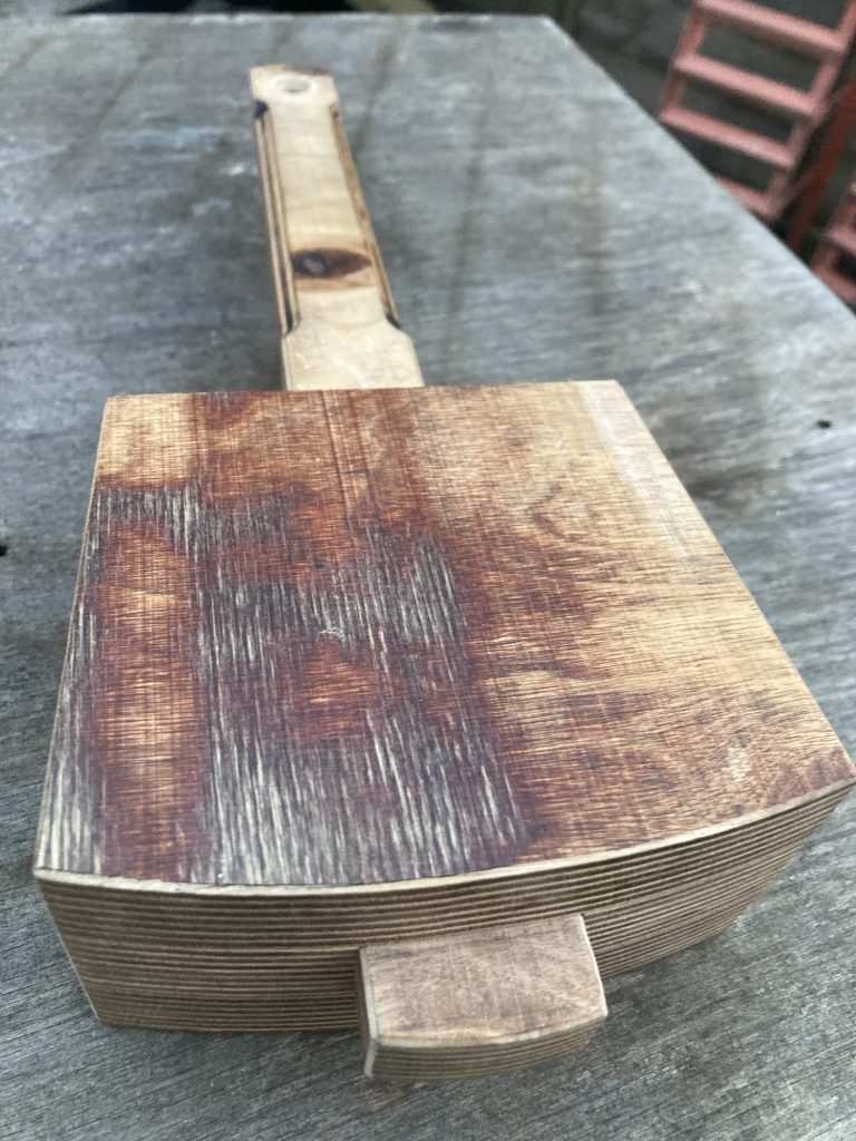 In attempting to finesse the overall form, I screwed up. To correct the mistake I wound up passing the body through the drum sander multiple times. The resulting tool is thinner than originally intended.