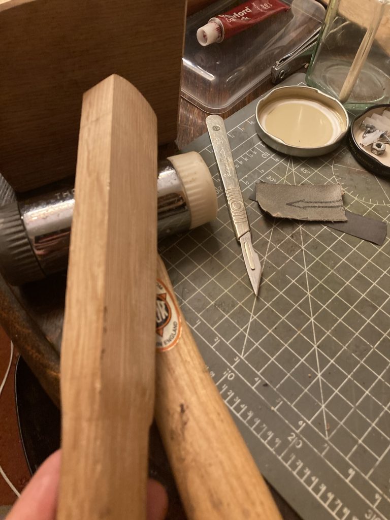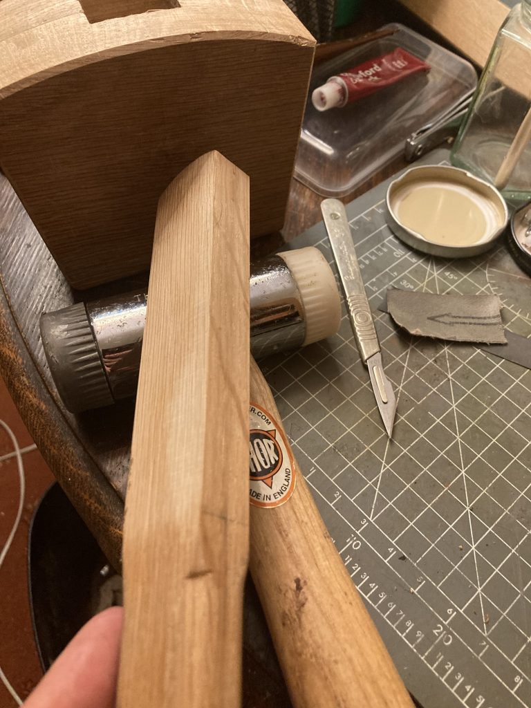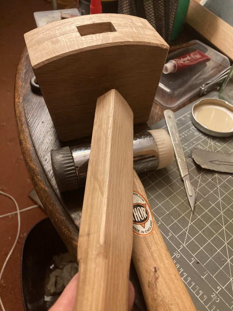 Having used the bevel-plane on Yanni’s mallet, I tried it on my oak mallet. It was harder to use, cutting into the denser oak. But it still worked. It would doubtless benefit from further sharpening, to get a slicker cut in hardwoods. But it still did the job, much to my satisfaction.