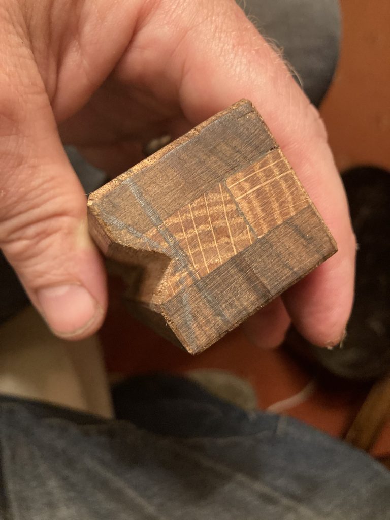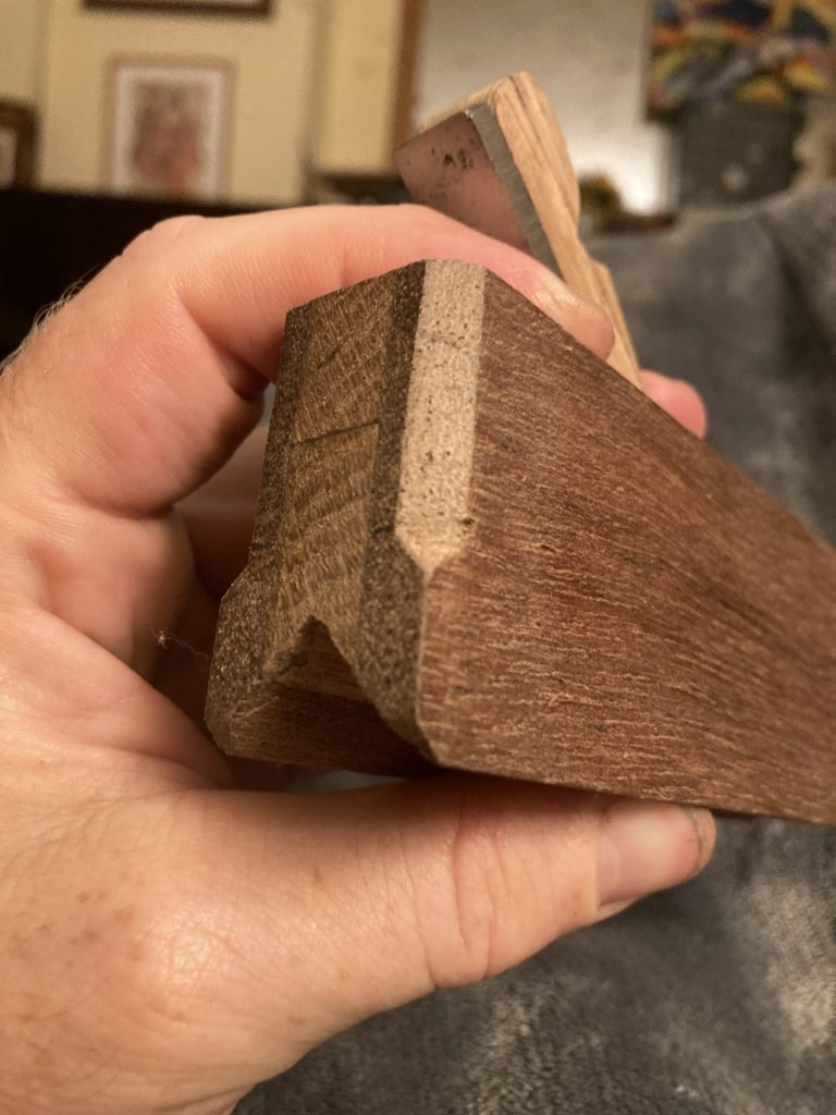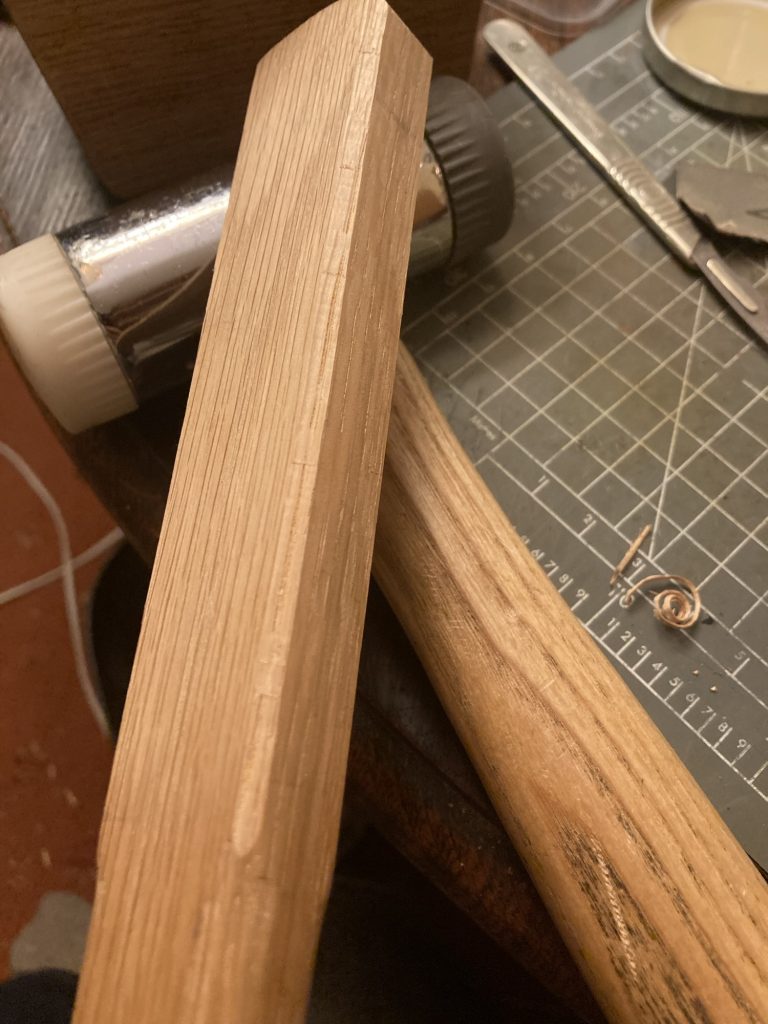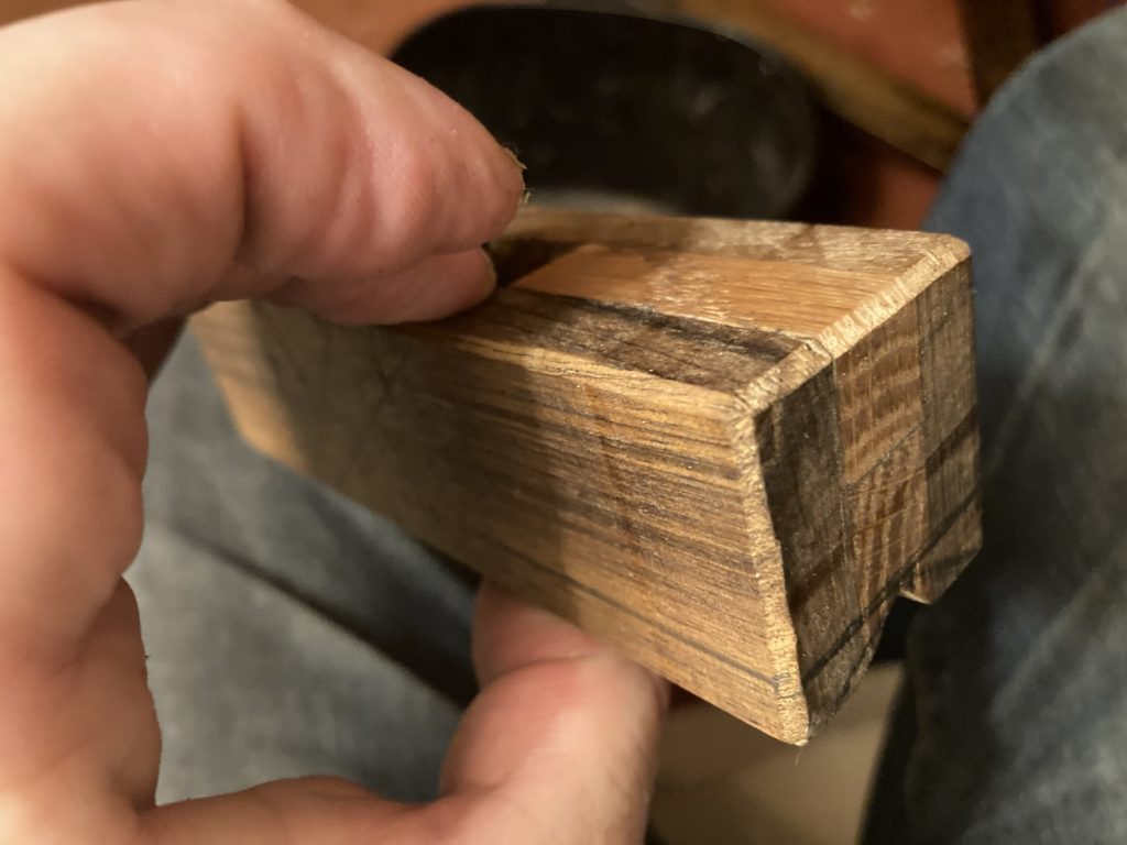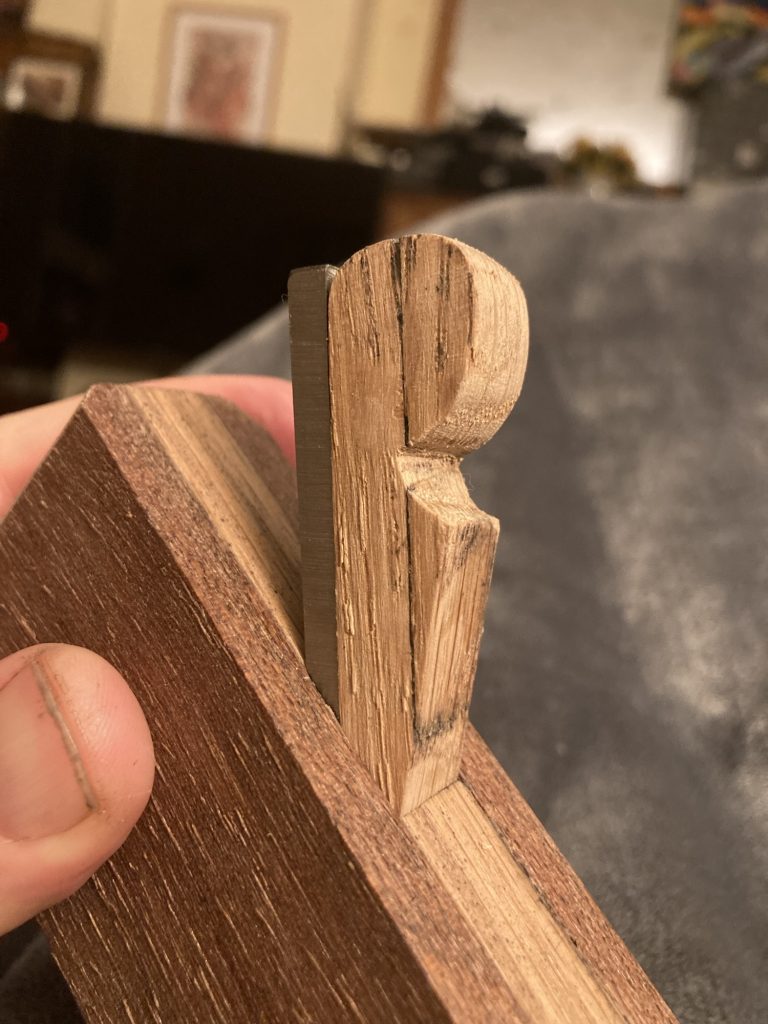 The central oak segment is slightly thinner this time. The wedge from the first plane fits. But the plane iron is a fraction too wide. I’ve been sanding it down like Billy-oh, but I’m still not quite there yet…