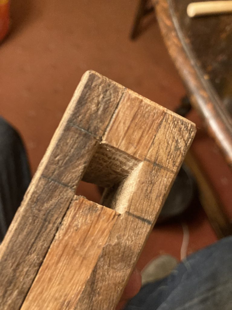 Made of oak. It’s been heavily weathered. Some of the timbers have dried out, bowed, and even cracked.