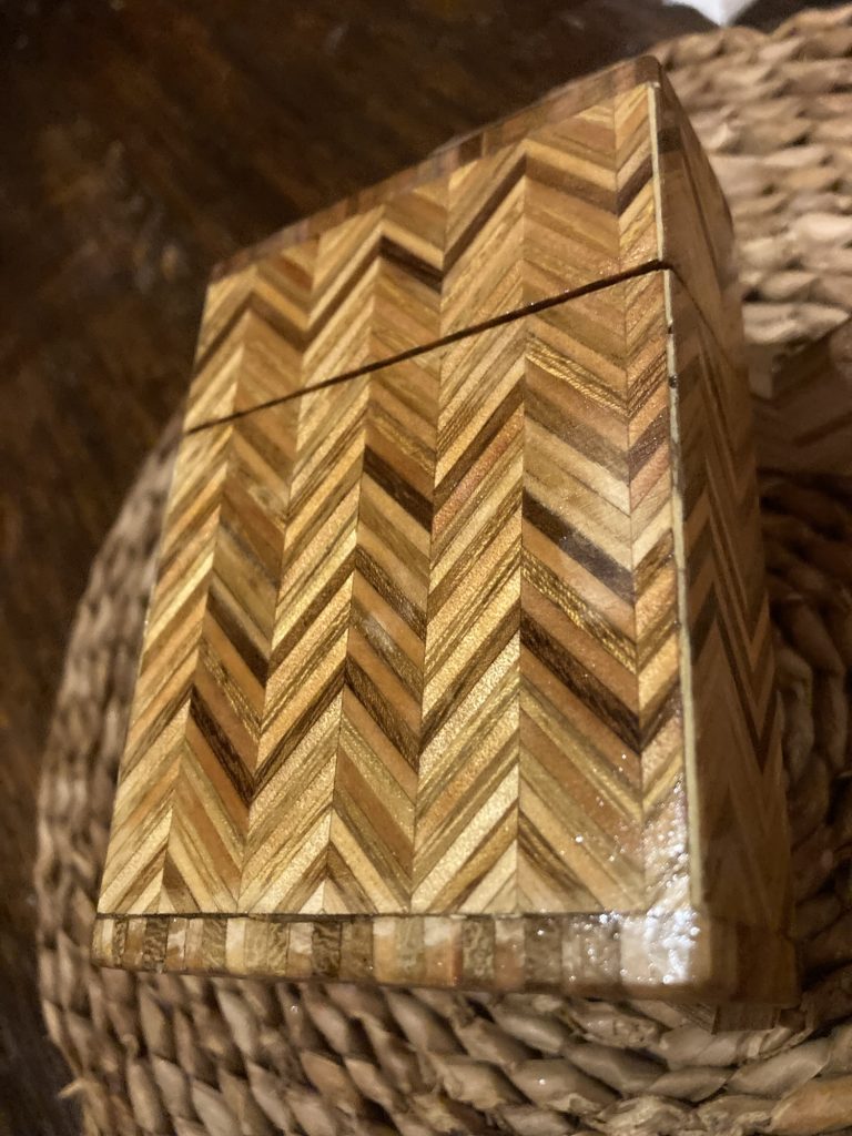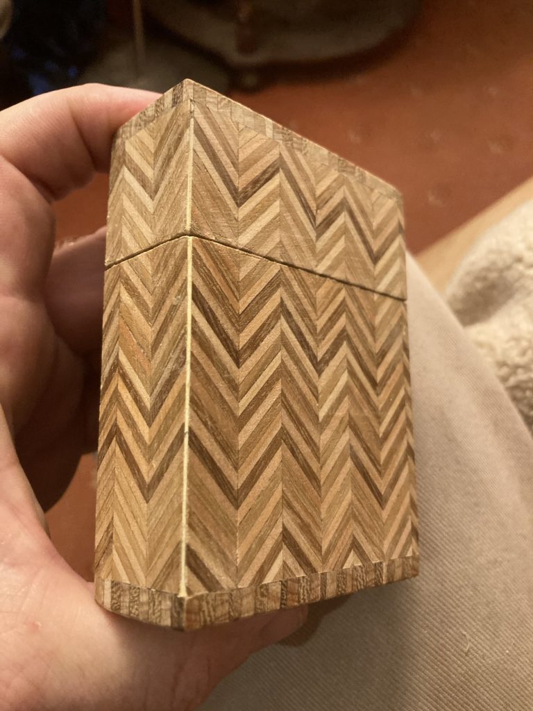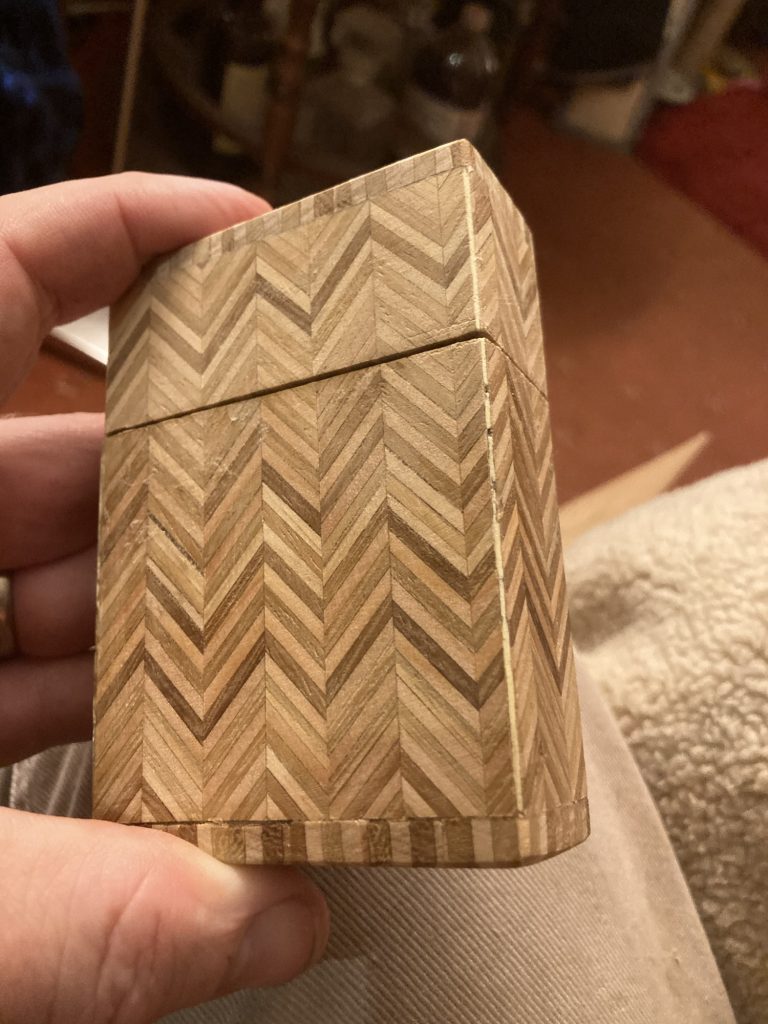 I decided to make a case for playing cards with this herringbone veneer. Here it is, above and below, at the end of the day, today.
