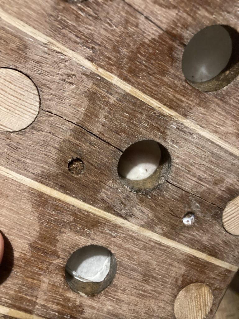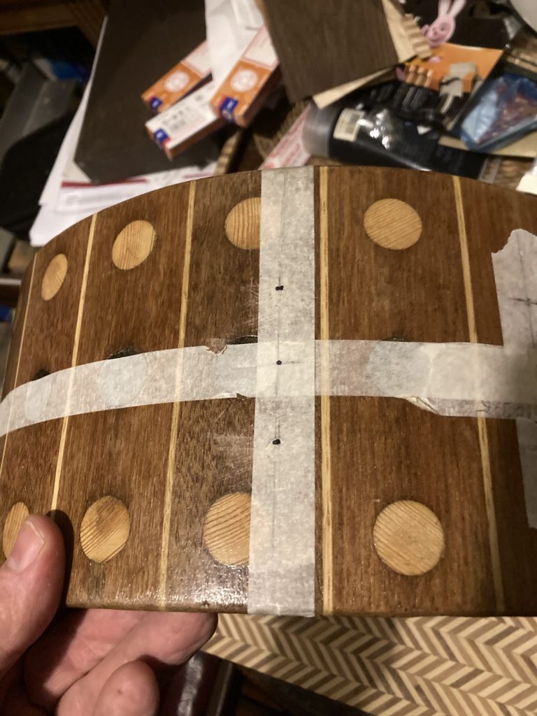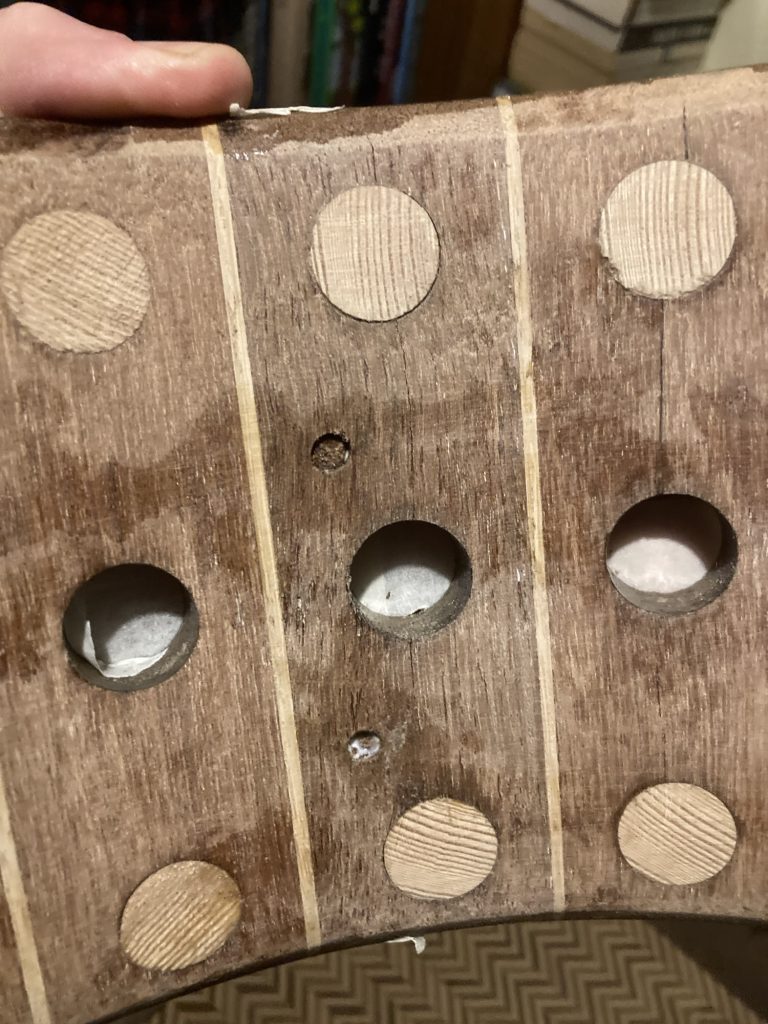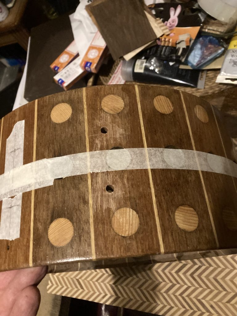 Knocking the dowels out and putting them into the correct holes? That more or less split the drum, for the umpteenth time! I guess tomorrow I’ll have to address that. Superglue, of wood glue? Hmmm…