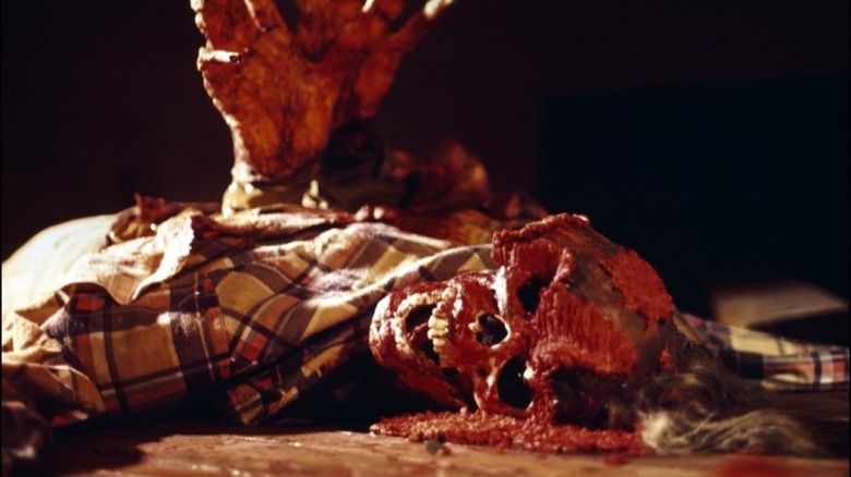 Ash and Scotty are the last; all three gals get possessed first. But not long after Scotty’s failed solo escape bid, it’s just Ash… As Scotty fades, and the gore revs up, the movie switches into a more overtly absurd and even morbidly comic mode…