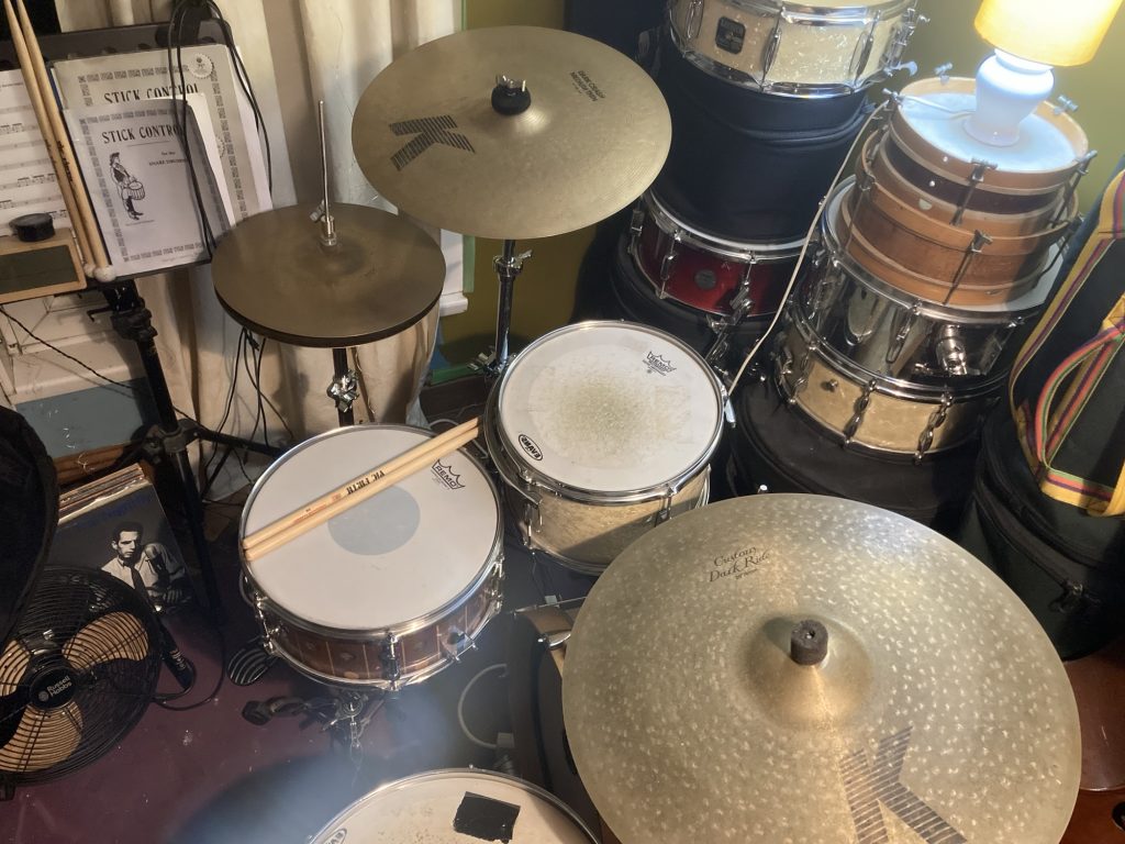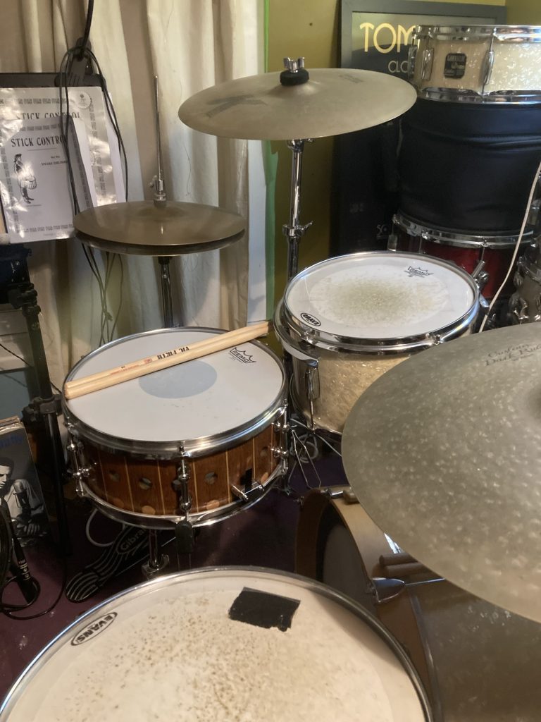 I also swapped out the temporary cheapo heads I had on their thus far, replacing the batter side with a coated CS Dot, by Remo, and a clear 300 Snare Side, from Evans. I’ll need to spend some time exploring tension/tuning.