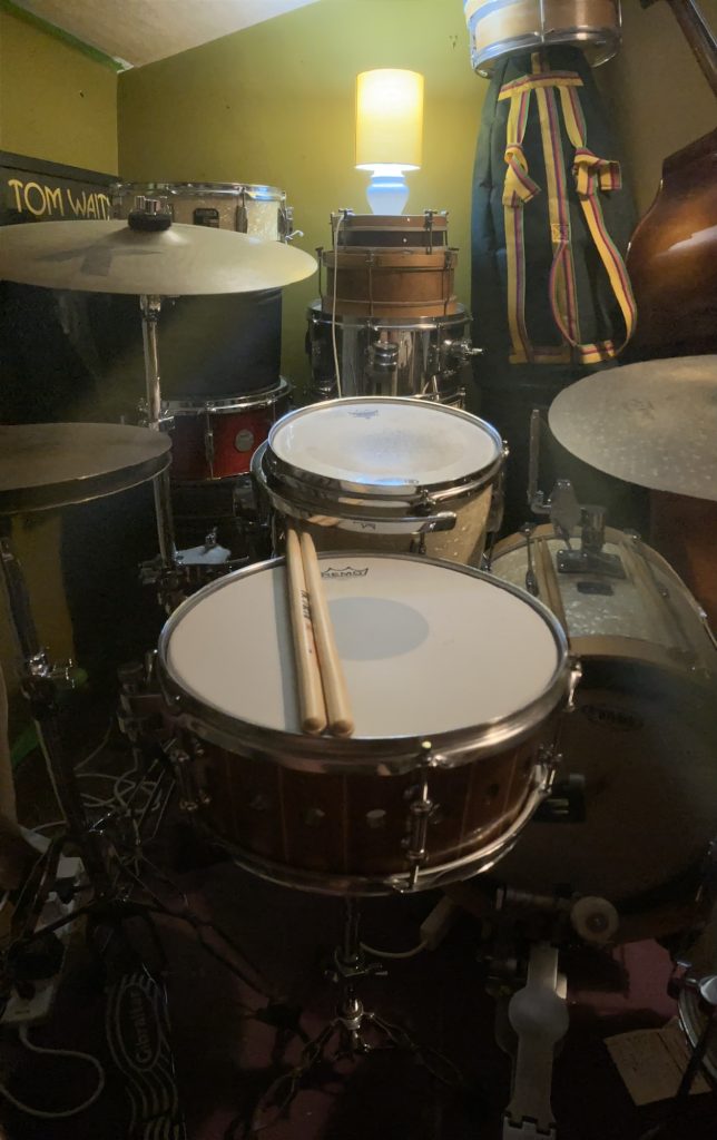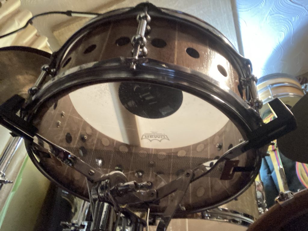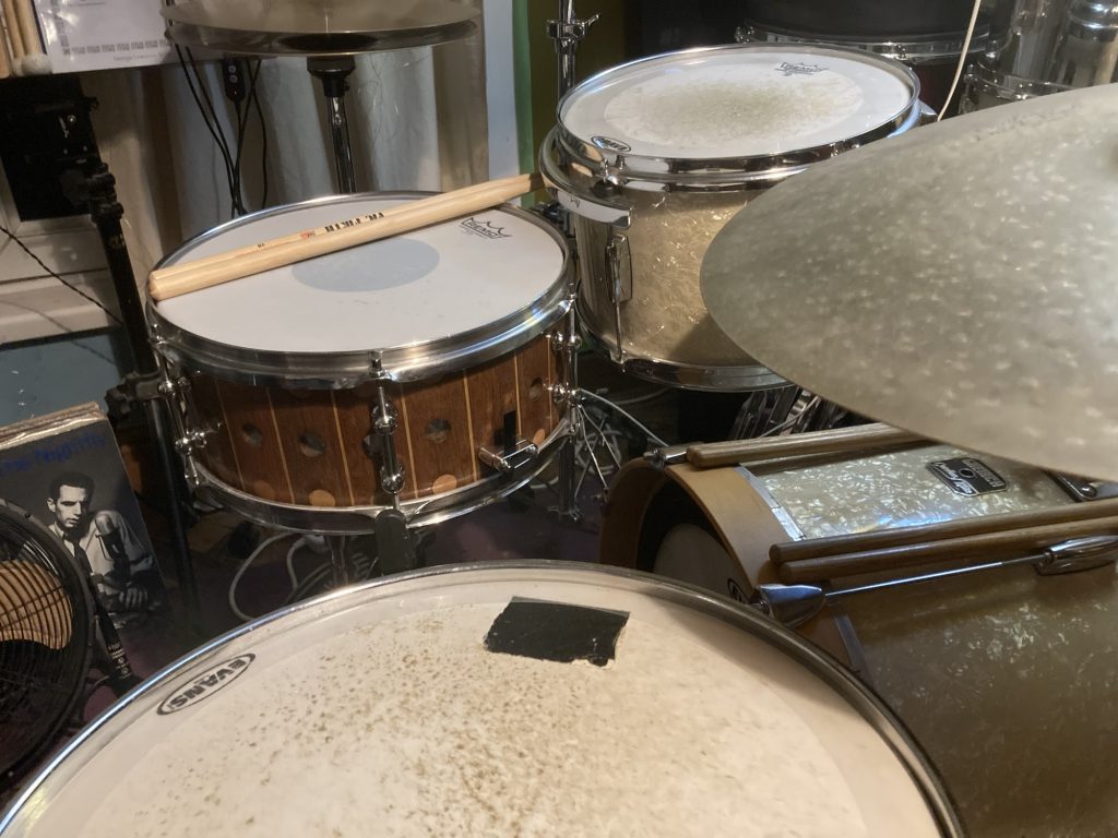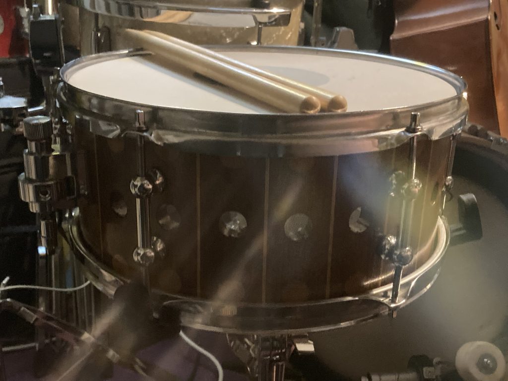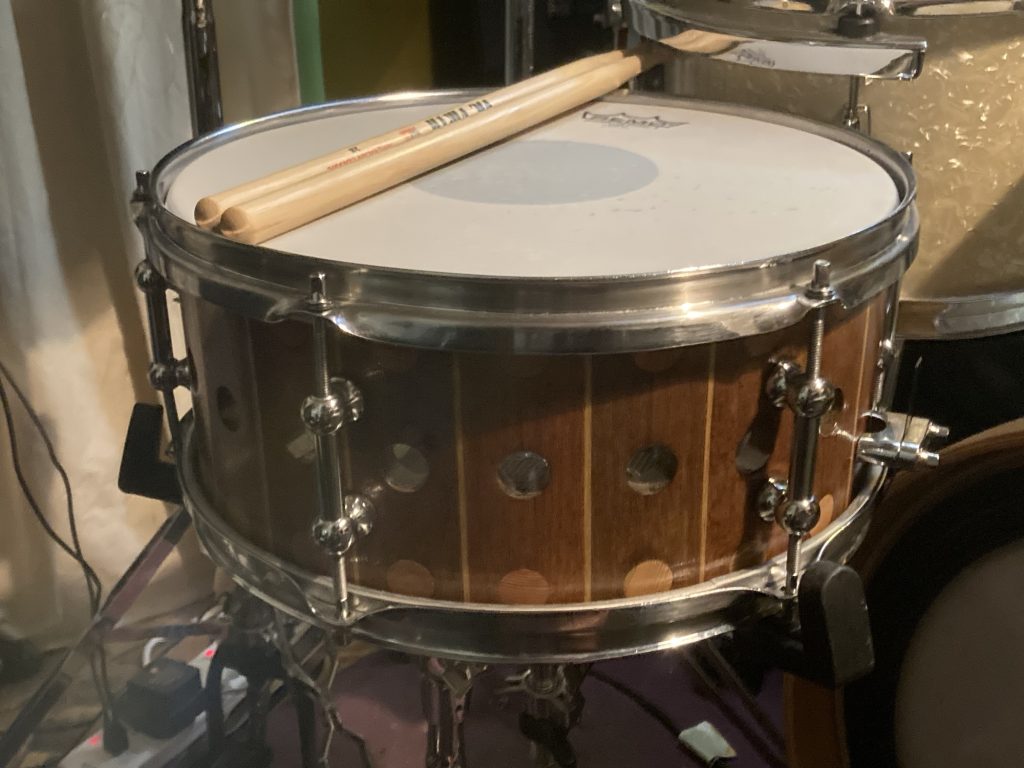 It was great fun to play my first self-built snare drum in the proper full context of a drum set. There’s a way to go to getting it to a place where I’m completely satisfied – tuning, damping, snare settings, head choices, poss’ even modifying the snare bed, etc. – but it’s fab’ to have gotten this far.