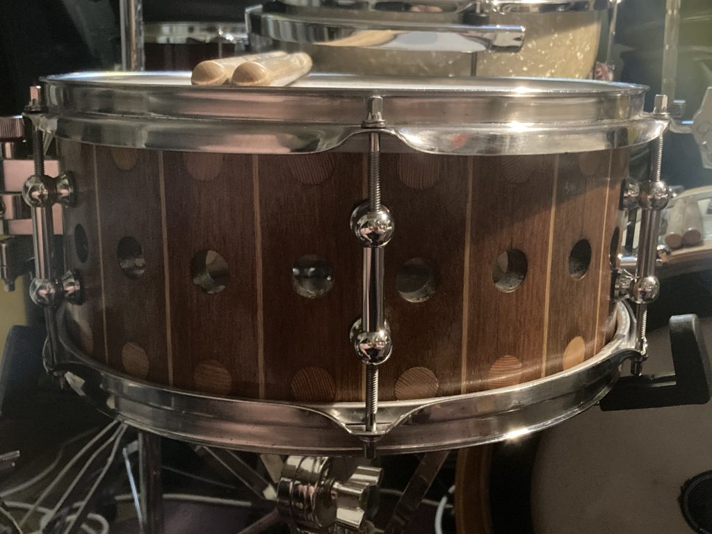 This snare is 13” x 5”, with the main body comprised of 22 Keruing staves, with White Oak pinstripes, and Pine(?) dots. There are twenty holes around the the drum, and thus no need for a vent.