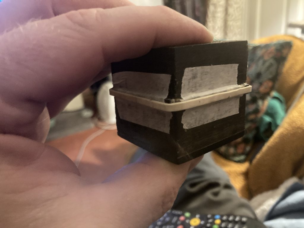 *As the keen eyed may spot, this little ‘un has several key changes in design: the herringbones are oriented horizontally, not vertically (more like road sign chevrons); the lid and base are ‘butt jointed’, or aligned horizontally.