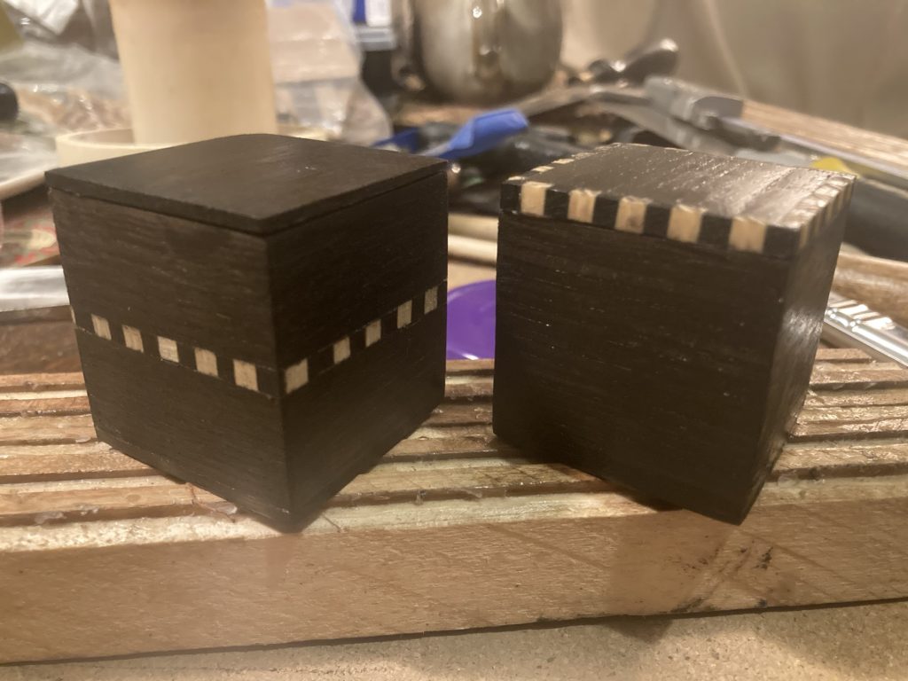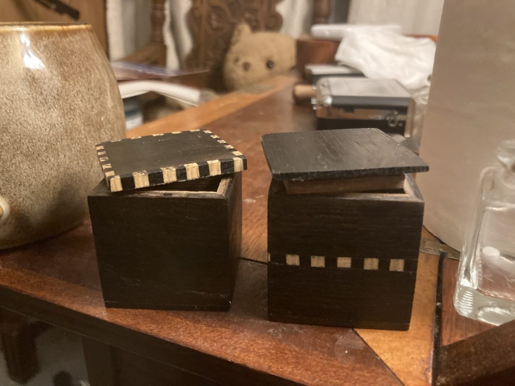 I’ve been using up the remainders and off-cuts from previous box making projects in the last few days, to make a few smaller boxes, some quite like Pat’s plectrum box. Others a bit different.