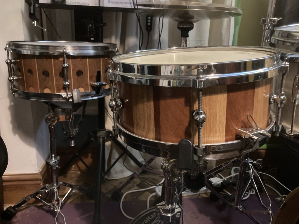 I finally have both of my self-built snare drums set up as part of my drum kit. And, to my immense relief and satisfaction, they sound – to my ears – as good as they look.