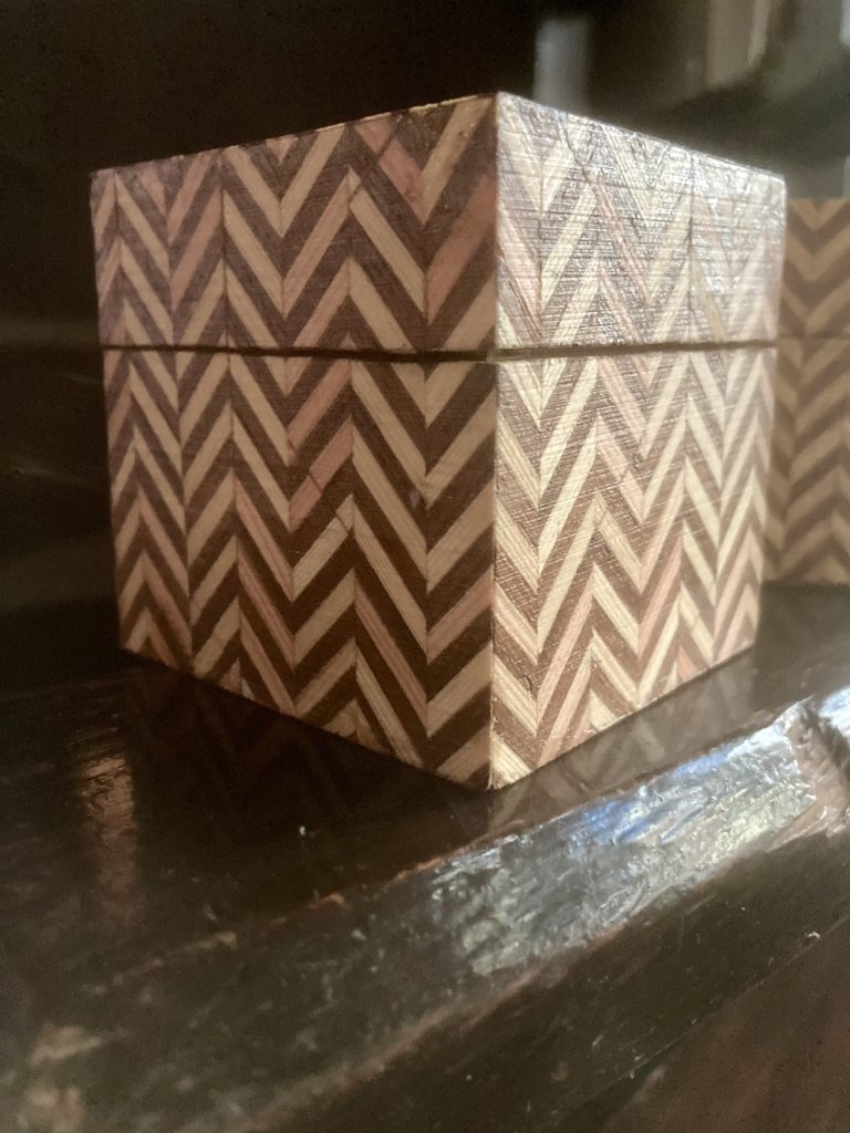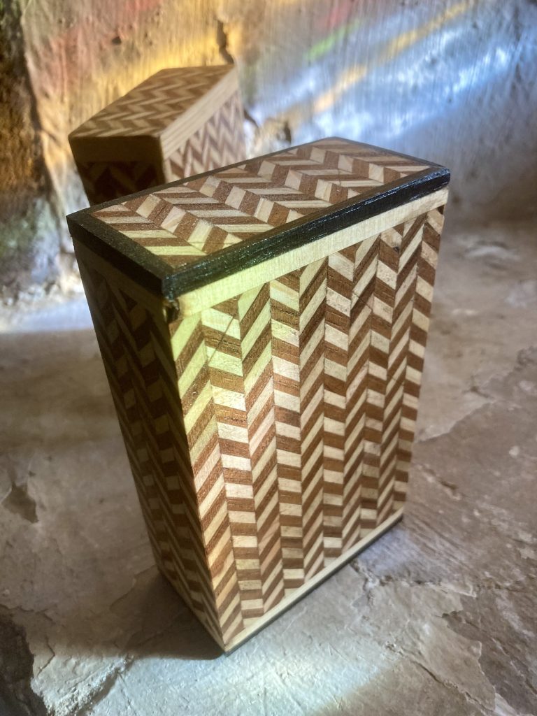 *As the keen eyed may spot, this little ‘un has several key changes in design: the herringbones are oriented horizontally, not vertically (more like road sign chevrons); the lid and base are ‘butt jointed’, or aligned horizontally.