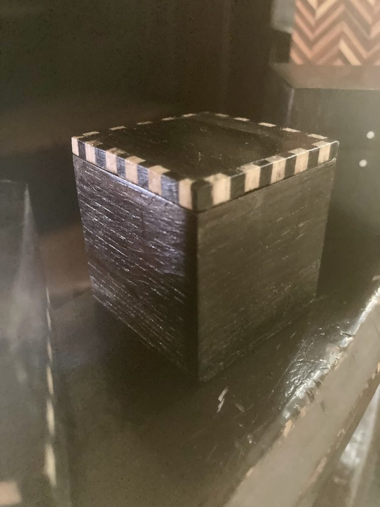 I’ve been using up the remainders and off-cuts from previous box making projects in the last few days, to make a few smaller boxes, some quite like Pat’s plectrum box. Others a bit different.