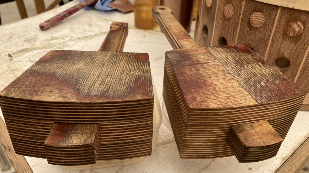 Tomorrow, at S&F, I’m intending to finish (or near enough finish) these two, by shaping the heads, sanding the whole lot, and applying some kind of finish. Linseed oil and paste wax, prob’. If I can source some?