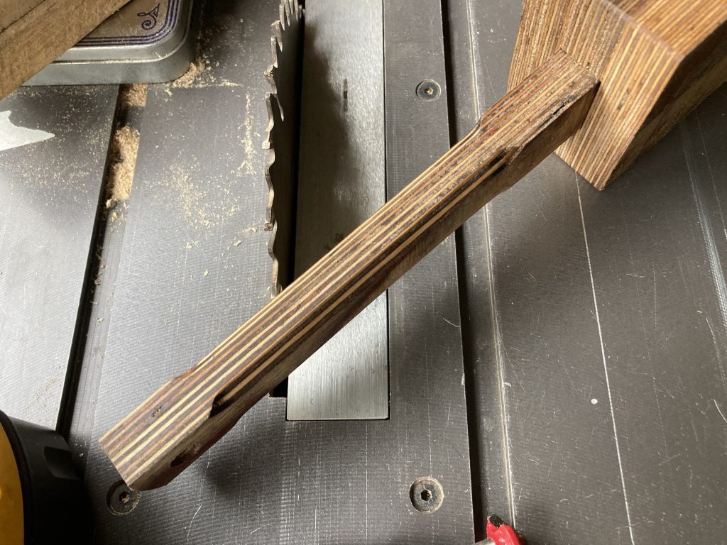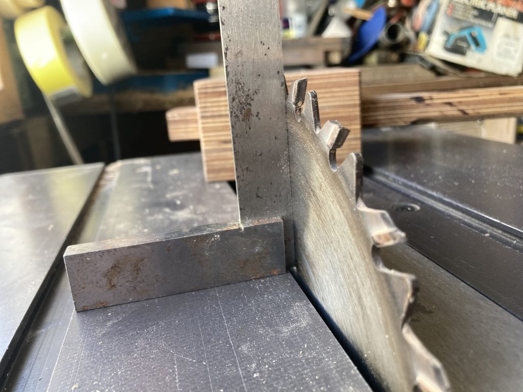 Above: checking the table saw for square. Pretty good. I butchered an old chisel, to get the cutting iron.