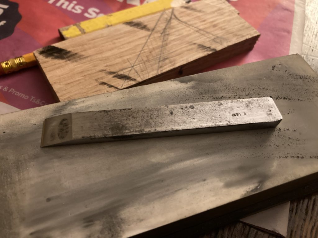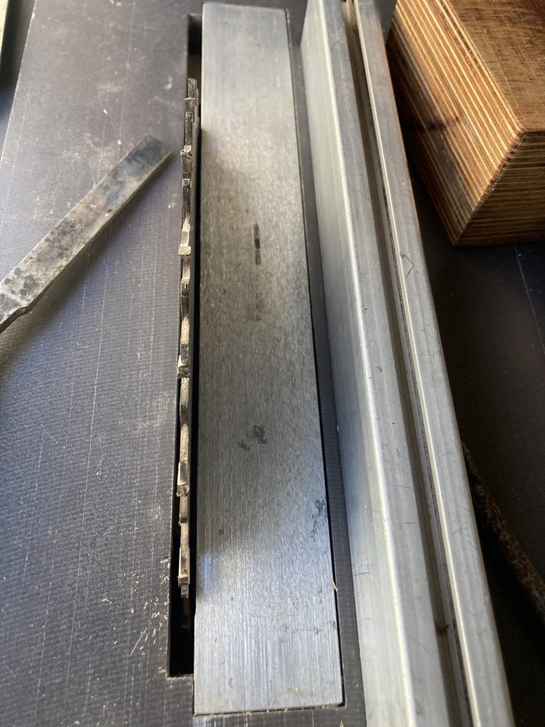 That’s where she’s at for now… The iron doesn’t come all the way through, to the sole. But that’s intentional. I need to cut a triangle in the base, the iron will protrude through, into that right angle, thereby cutting the bevel.