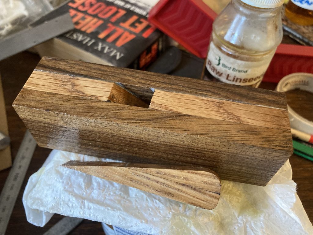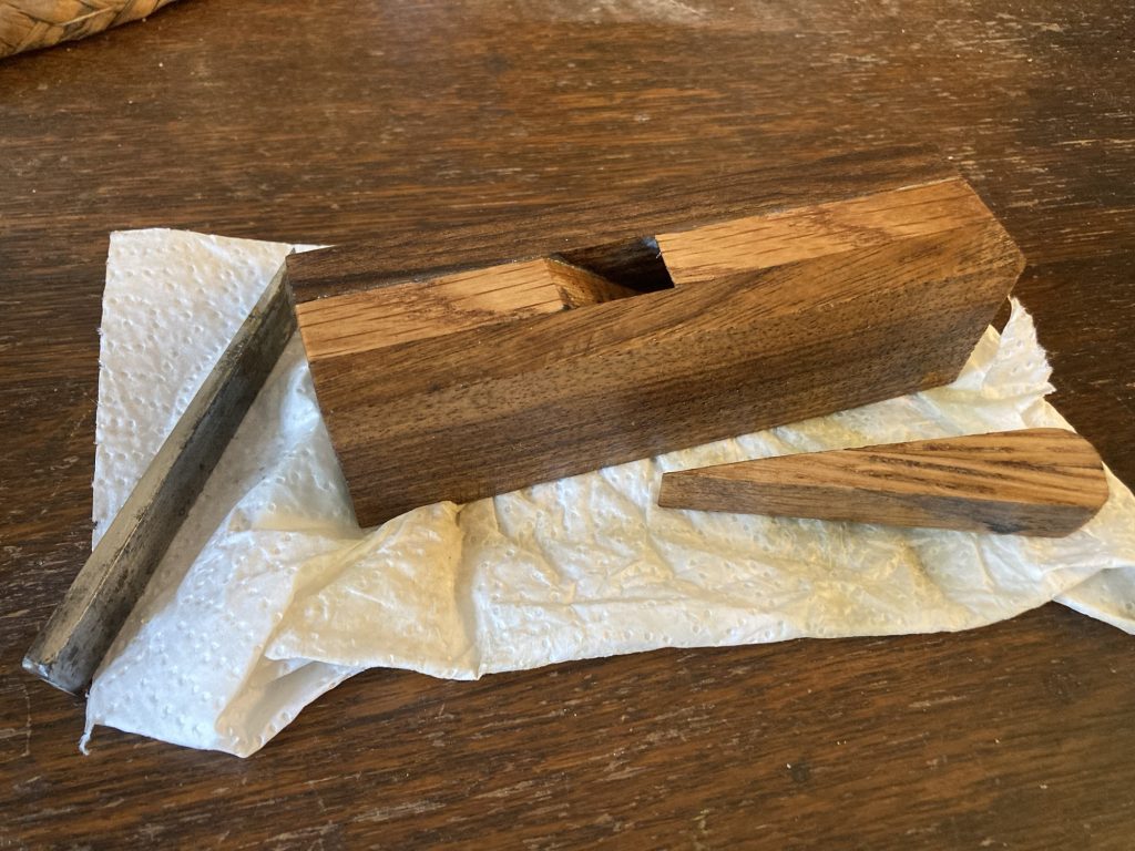 The plane is basically dimensioned, the iron roughly shaped, and the (?) shaped. I painted some Rustin’s pre-stain on it. Let that dry, a d then put a layer of linseed oil on.