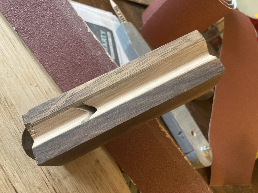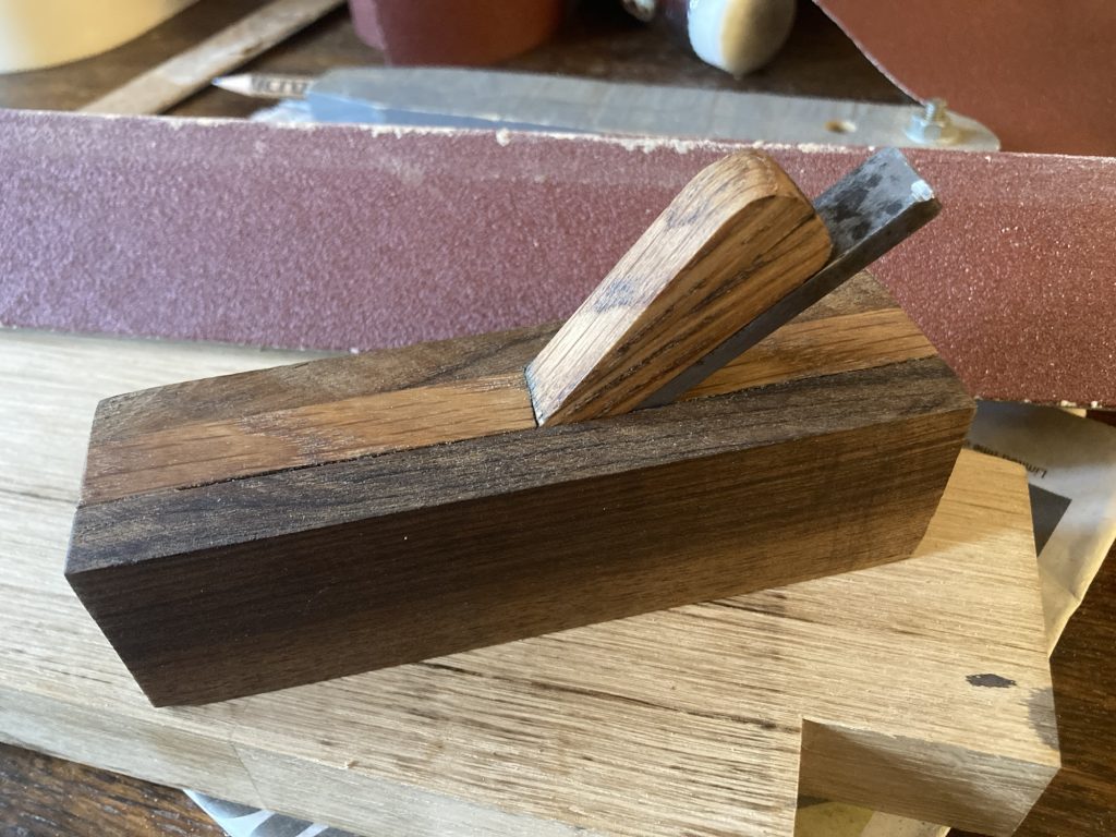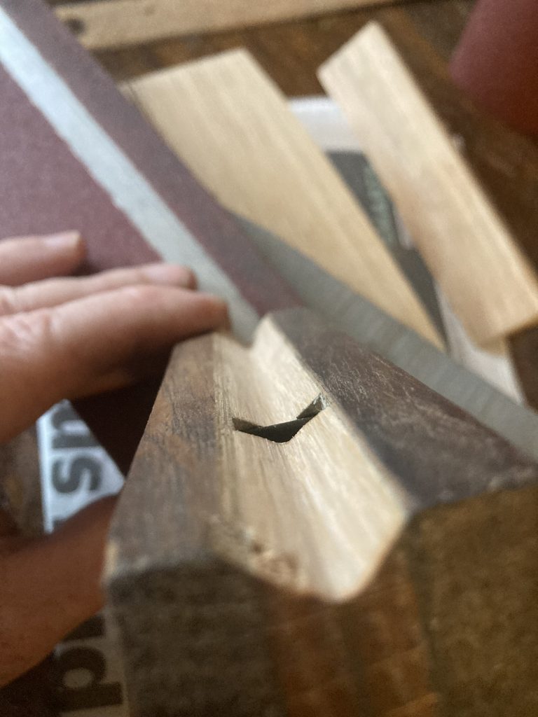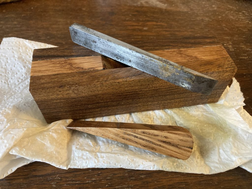 Having improved the groove, I tried setting the blade, or ‘iron’, and the wedge that holds it, in situ. After a few failed attempts (and much sanding of the iron, mostly trying to reduce the width a little, for a better fit), I finally got there.