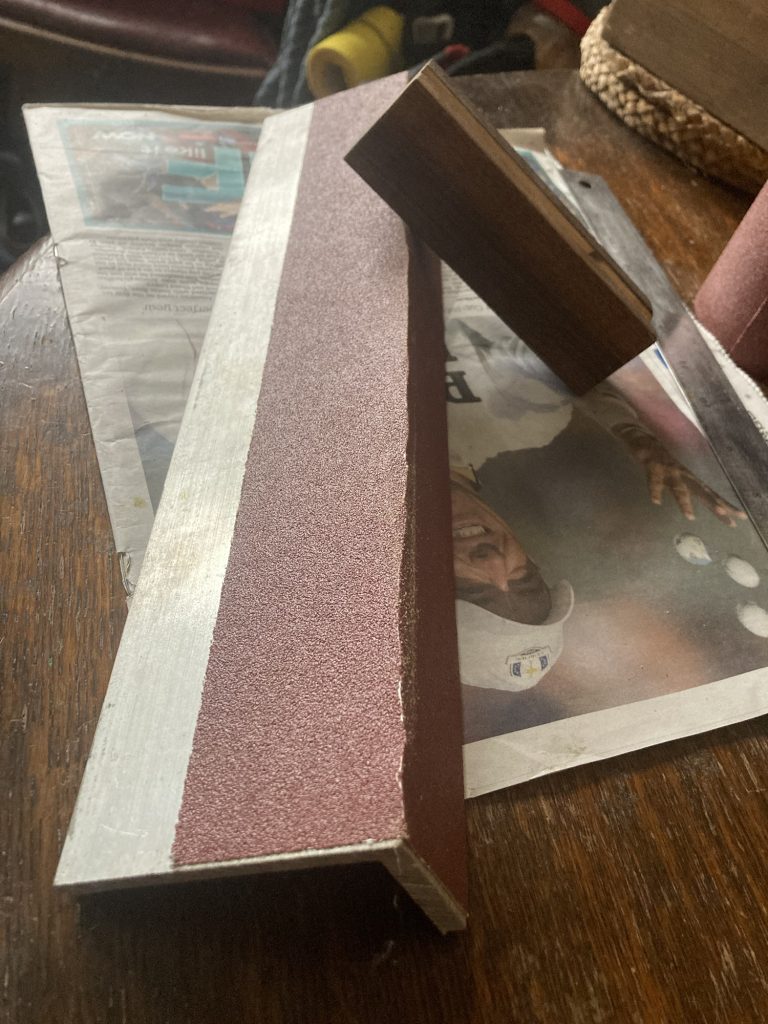 So, after attempting to tidy things up with chisels (a slight improvement), I came up with the right-angle sanding jig, shown below.