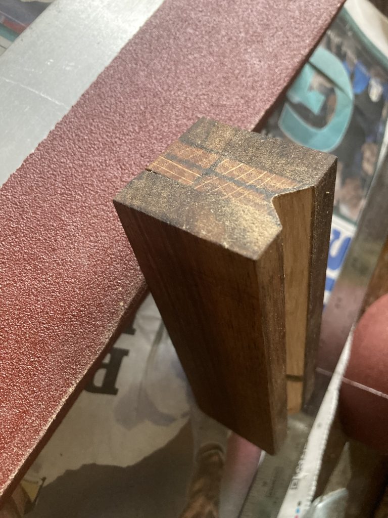 I decided to: shape it a bit more, and thereby improve it aesthetically (even if only a little it!); cut it in half, sand it down, and re-glue it, so the saw blade groove was appropriately sized; and shellac it.