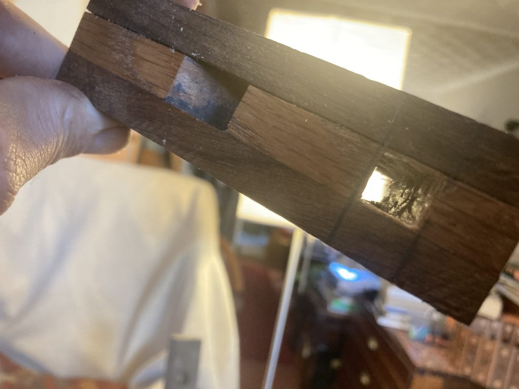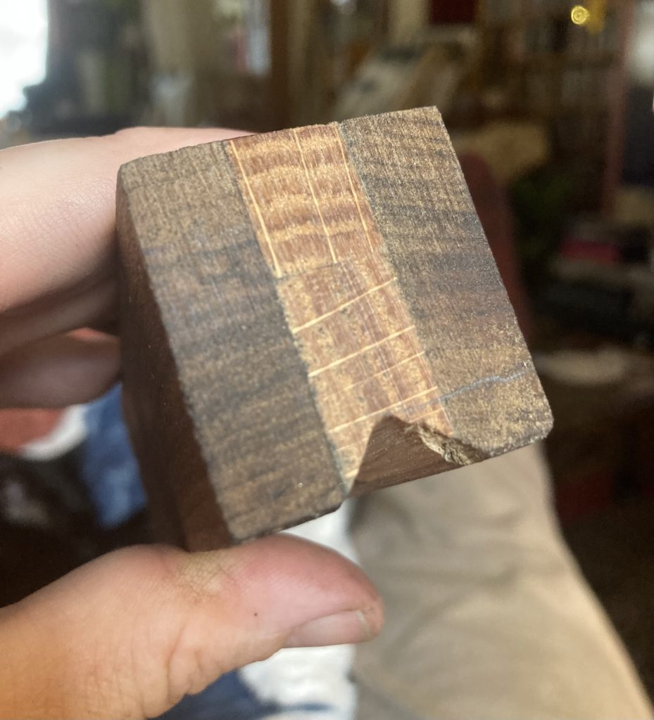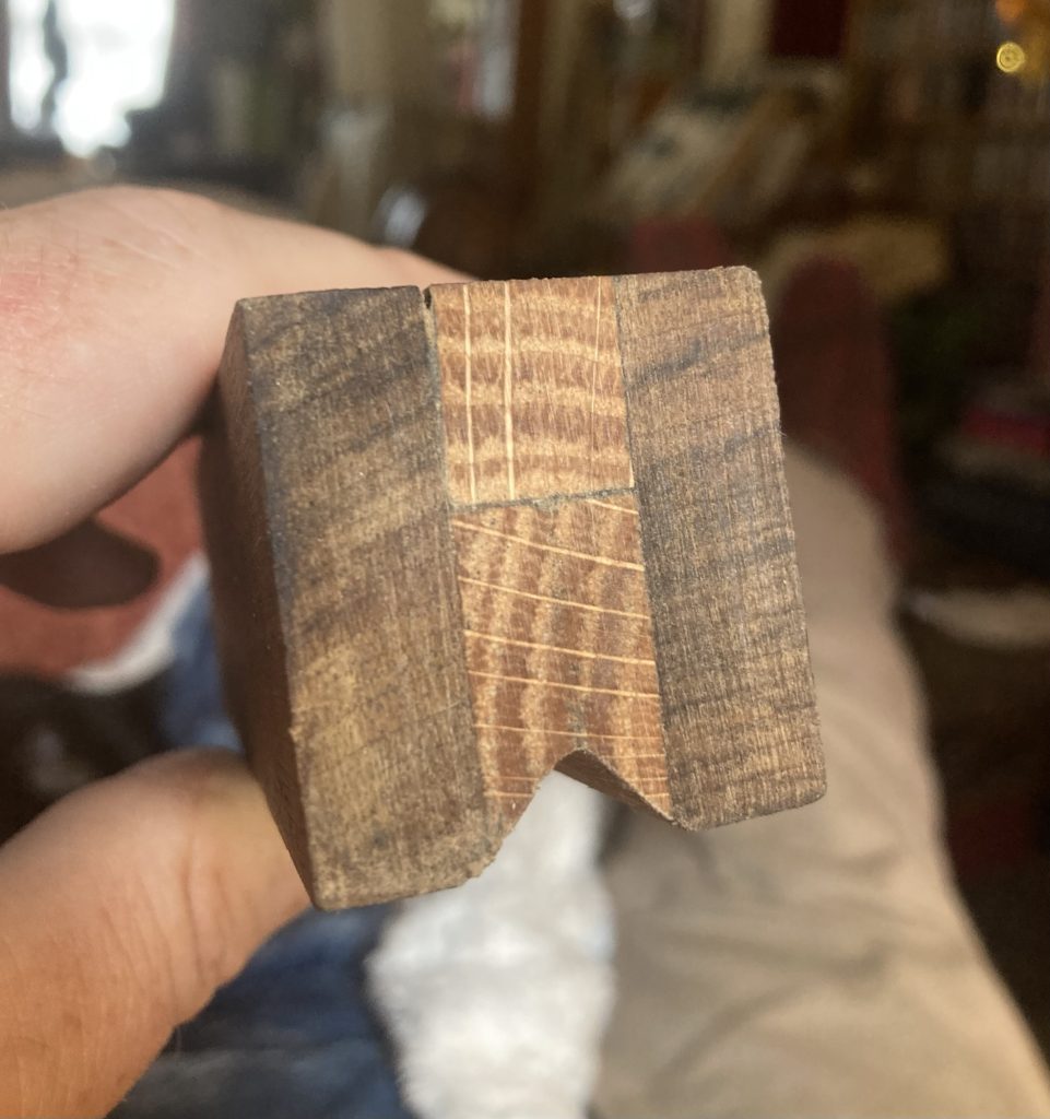 In the gallery below, pics one and two see me carve and fit a repair using the wrong wood (rosewood). Oops! Pics three and four I’m back using Keruing, aka the right wood.