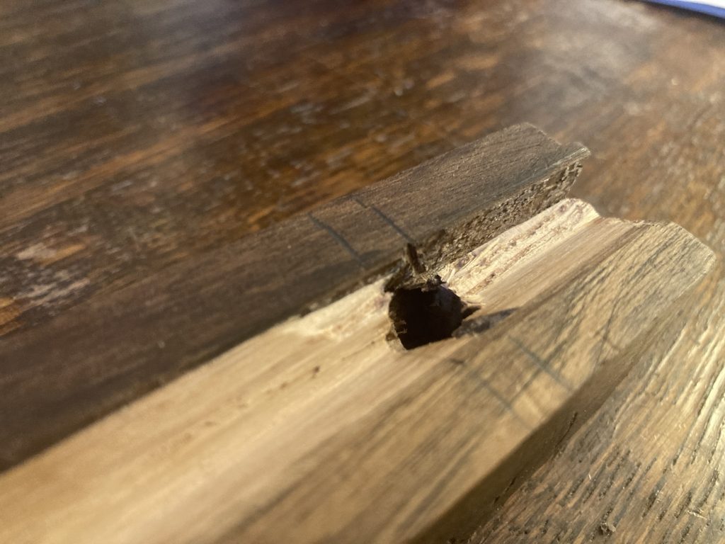 The bottom four photos, above, show other lesser bits of shell damage (pics five and six), and dowels that are no longer fully flush (seven and eight).