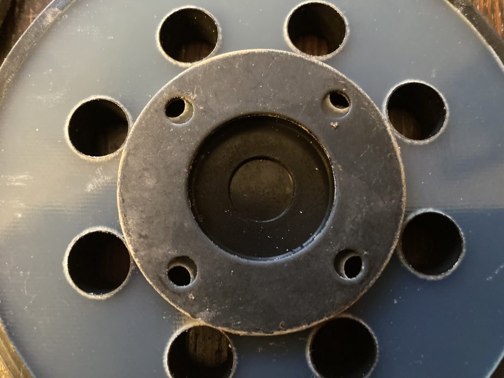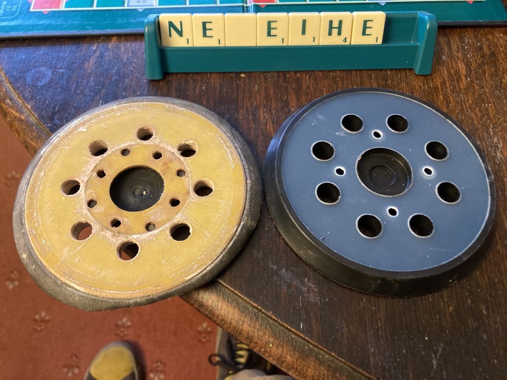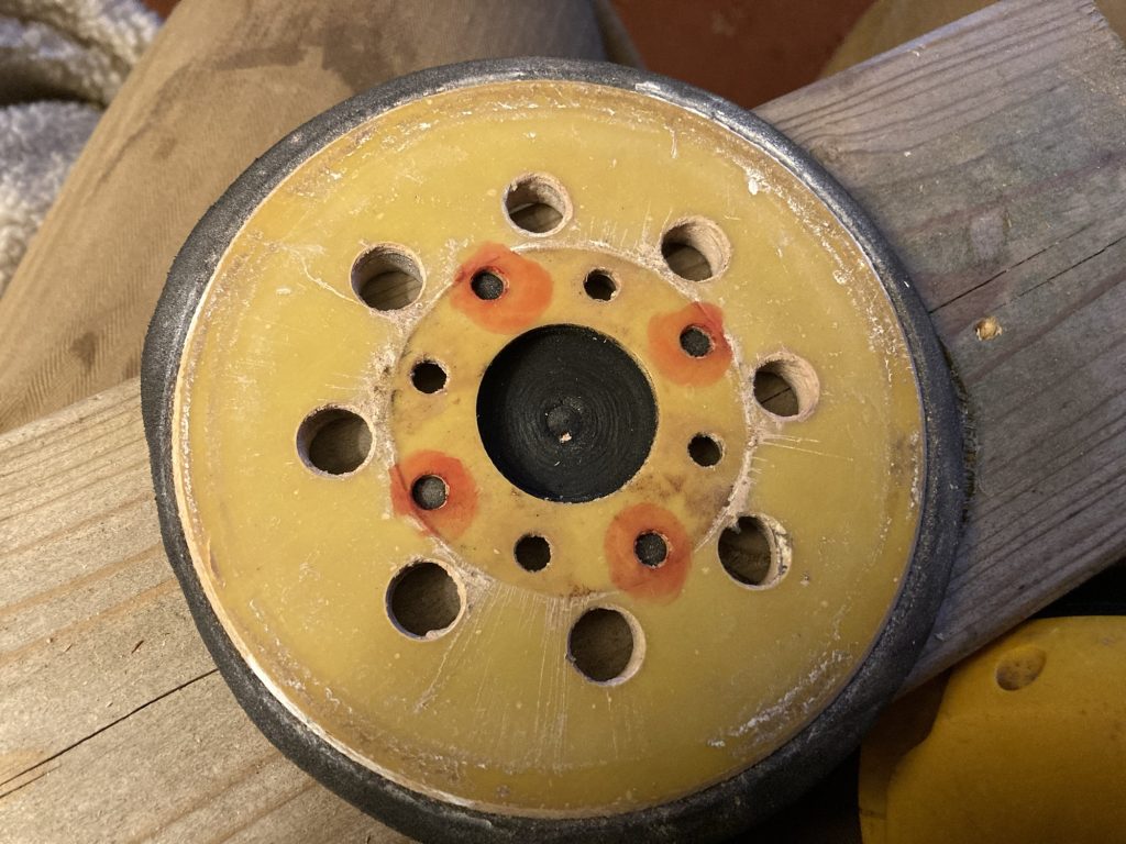 As I’d feared, the new pad I ordered, via Amazon, wasn’t an accurate match; the four mounting holes on my sander being just a wee bit closer together. This can be seen in the pic’ below (orbital sander ring, on top of the new pad, illustrates the issue).