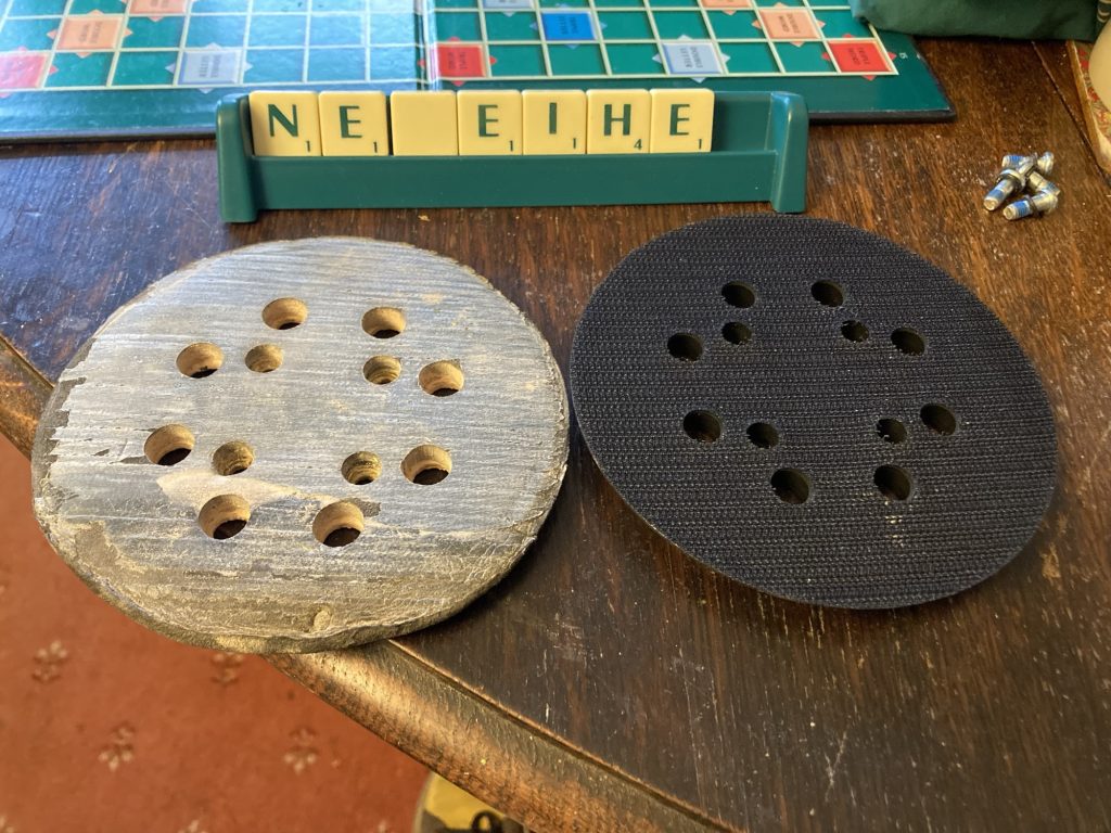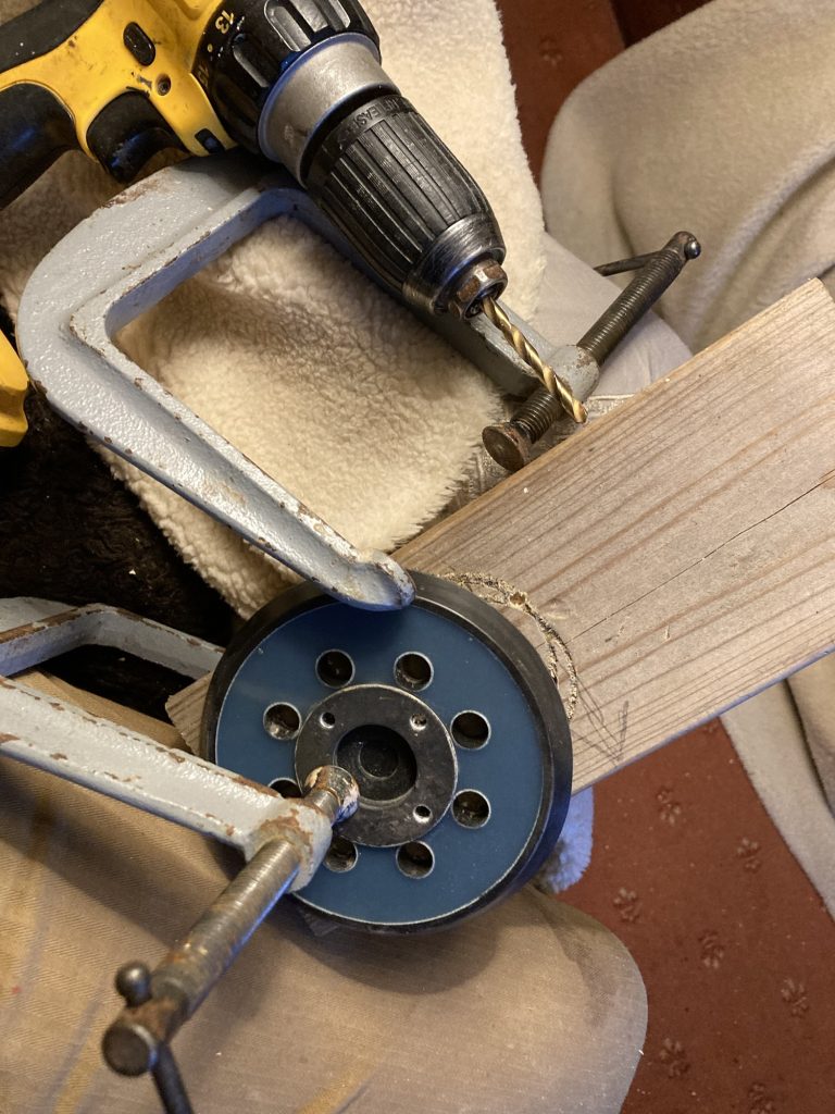 In the end I used the holes on the little metal ring (that goes ‘twixt pad and sander) to drill more accurately located holes on the new pad. To my great relief, this worked.