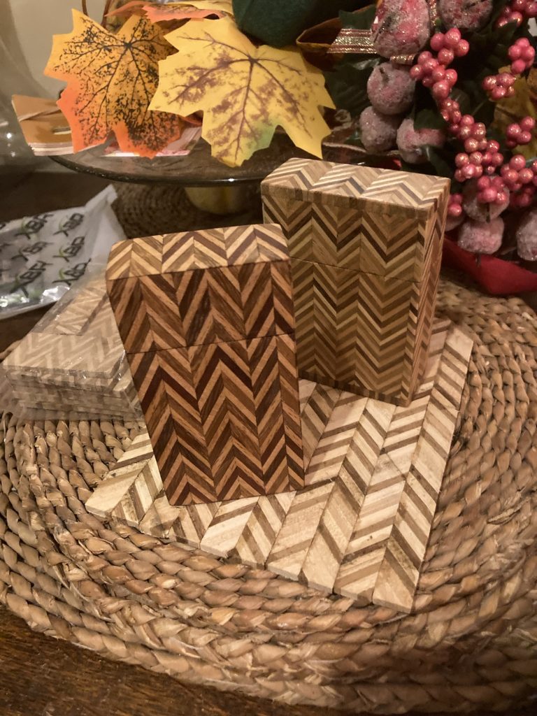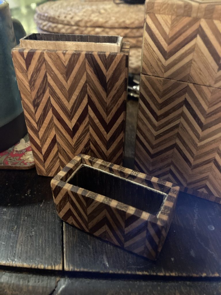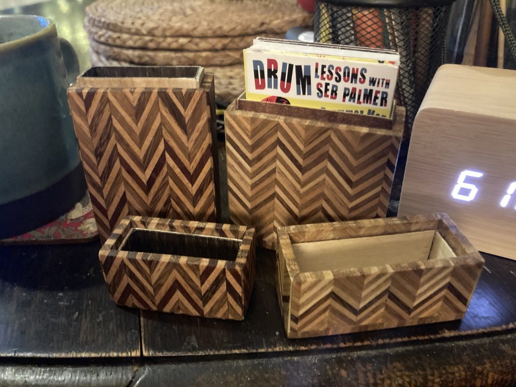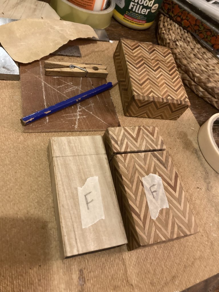 I’m dead chuffed with these little boxes. My first was a practice/learning run. And has come out lovely. The second is a commission. And improves on the first in some ways (all edges bevelled!).